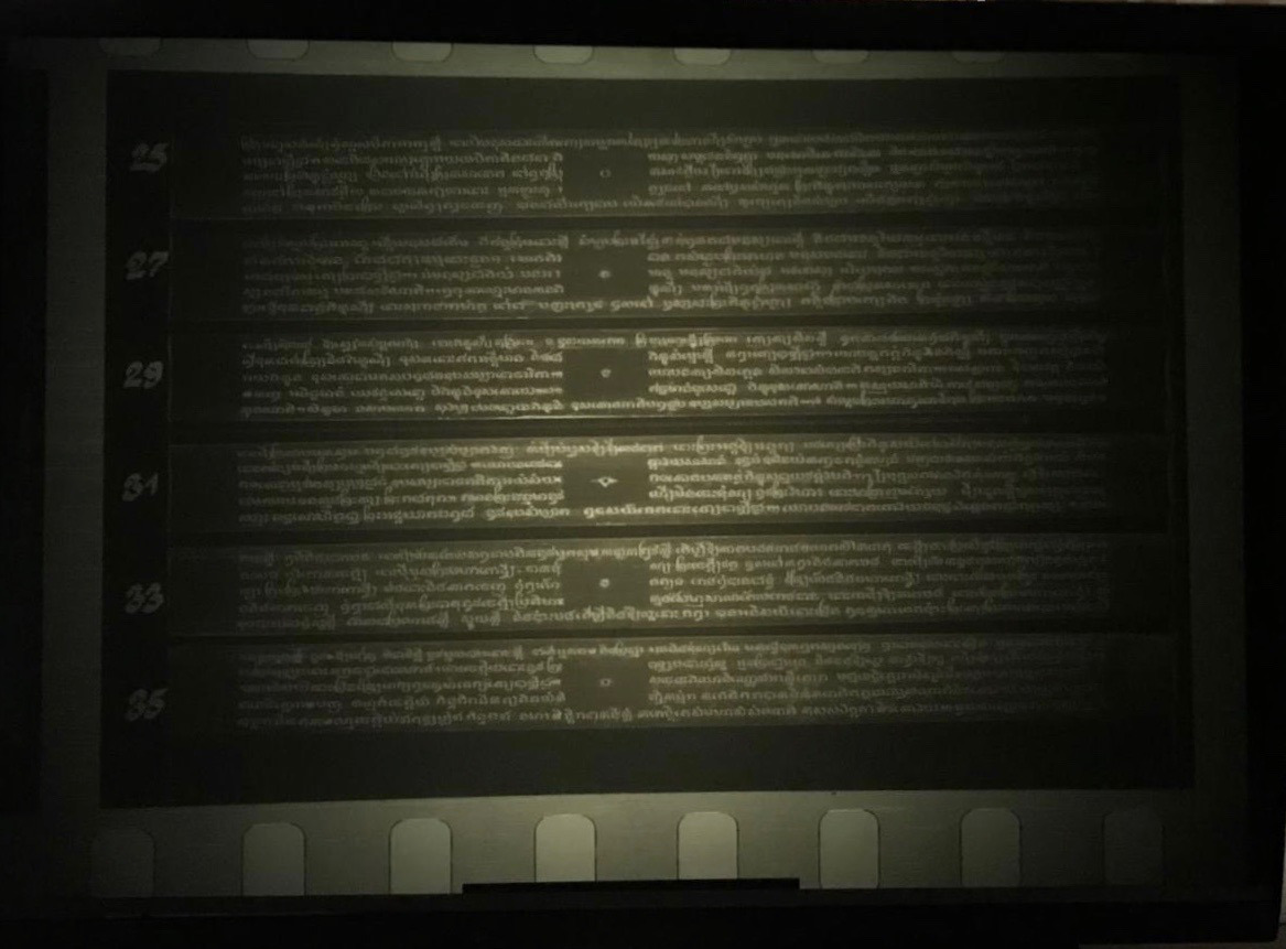 In parallel to this extensive conservation and preservation work, the EFEO-FEMC project published the first and second volumes of the Provisional Inventory of Cambodian Manuscripts, and the filming of manuscripts between 1991-2004 produced some 400 strips of black-and-white film, documenting 757,507 pages of manuscripts. All photography was done in situ, using a Nikon F3 camera with a special back enabling 250 shots on Kodak Technical Pan and Kodalite black and white film. Copies of the negative and positive films kept at Wat Ounalom in Phnom Penh were originally digitized in 2009, under a joint EFEO-UNESCO program funded by the Embassy of Singapore. These black and white films, together with a collection of scanned leporello manuscripts and inventory data sheets, were newly digitized by Digital Divide Data as part of the collaborative project between BDRC and EFEO-FEMC in 2019-2021, and are now freely available via BUDA.